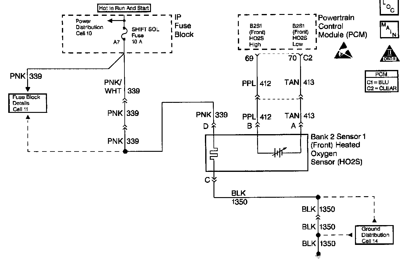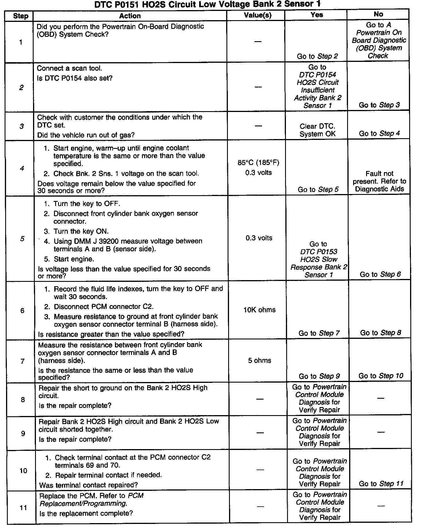 The PCM provides a 0.45 volt reference signal to the oxygen sensor on CKT 412. When the oxygen sensor is cold, below 200°C (392°F), the Oxygen Sensor signal voltage will be around 0.45 volt and the PCM will keep the system in Open Loop operation. When the oxygen sensor is warm, above 200°C (392°F), the oxygen sensor will swing from rich to lean rapidly, if the PCM is in good control of the air fuel mixture. DTC P0151 is designed so that if the oxygen sensor stays at a lean voltage for more than 40 seconds during the test conditions, this DTC will set. DTC P0151 will set when: