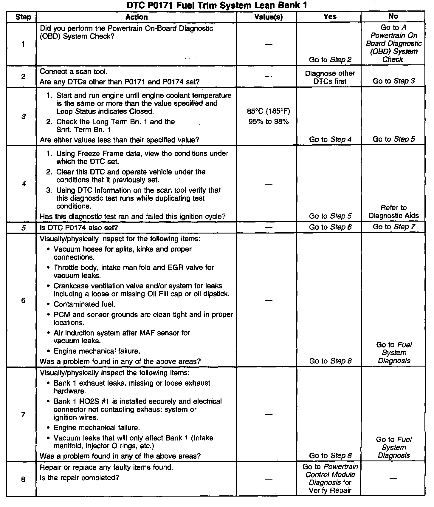 To provide the best possible combination of driveability, fuel economy and emission control, a Closed Loop air/fuel metering system is used. While in Closed Loop, the PCM monitors the heated oxygen sensor signal voltage and adjust fuel delivery based on signal voltage. A change made to fuel delivery will be indicated by the long and short fuel trim values which can be monitored with a scan tool. Ideal fuel trim values are around 0%: if heated oxygen sensor signal is indicating a lean condition, the PCM will add fuel, resulting in a fuel trim above 0%, 100% is maximum lean. If a rich condition is detected, the fuel trim values will be below 0%, -99% is maximum rich, indicating that the PCM is reducing the amount of fuel delivered. If an excessively lean condition is detected, the PCM will set DTC P0171.