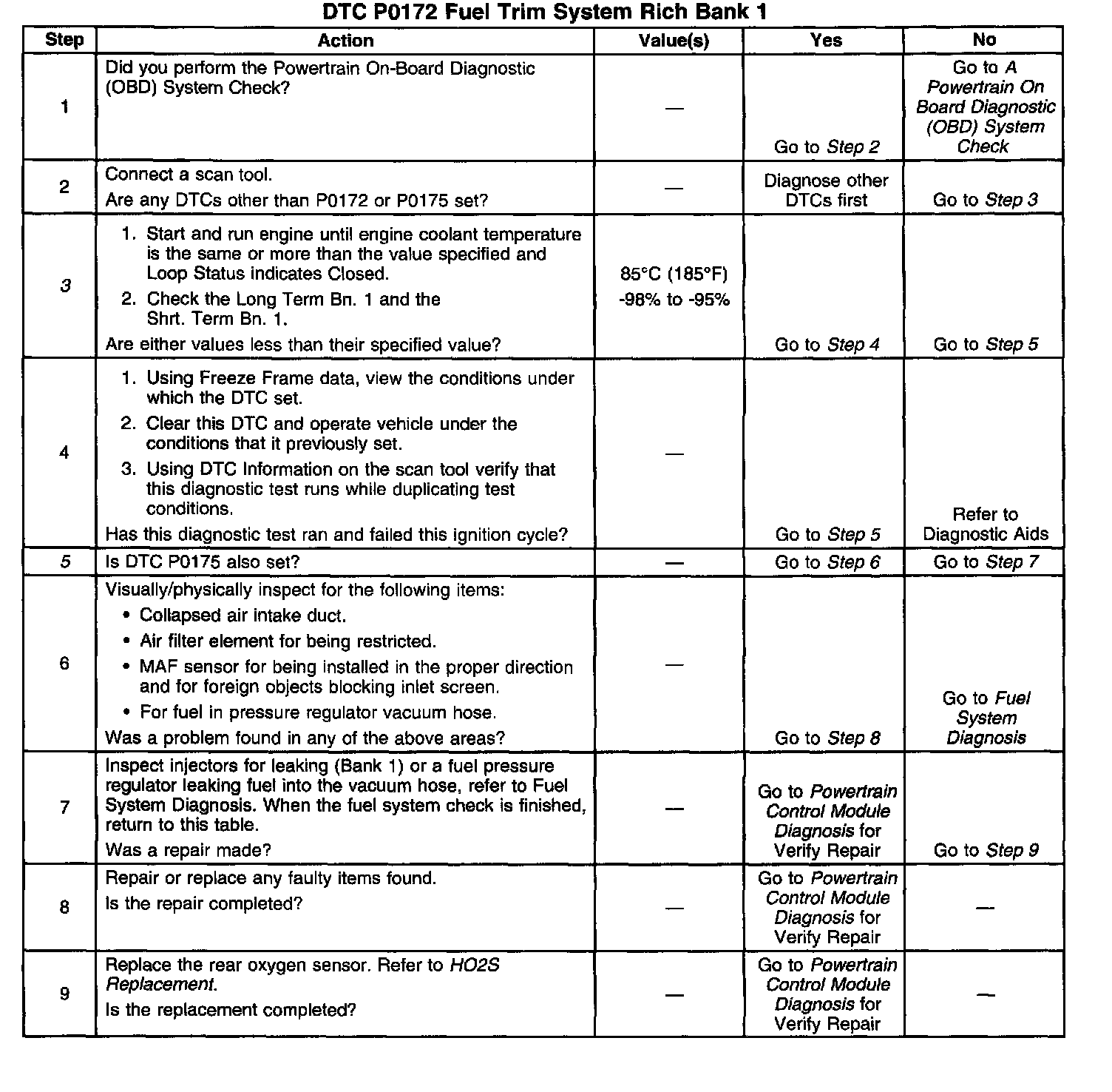 To provide the best possible combination of driveability, fuel economy and emission control, a Closed Loop air/fuel metering system is used. While in Closed Loop, the PCM monitors the heated oxygen sensor signal voltage and adjust fuel delivery based on signal voltage. A change made to fuel delivery will be indicated by the long and short fuel trim values which can be monitored with a scan tool. Ideal fuel trim values are around 0%; if heated oxygen sensor signal is indicating a lean condition, the PCM will add fuel, resulting in a fuel trim above 0%, 100% is maximum lean. It a rich condition is detected, the fuel trim values will be below 0%, -99% is maximum rich, indicating that the PCM is reducing the amount of fuel delivered. If an excessively rich condition is detected, the PCM will set DTC P0172.