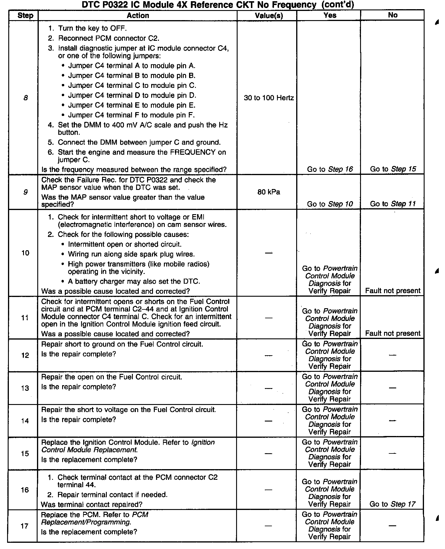 8. Checking for 4X reference pulses on Fuel Control circuit from the Ignition Control Module to the PCM. If the frequency is between 30 and 100 Hertz, the PCM is receiving 4X reference pulses.