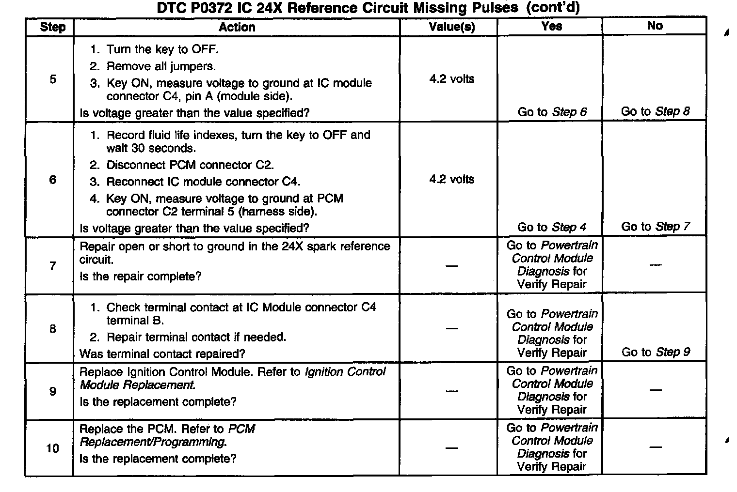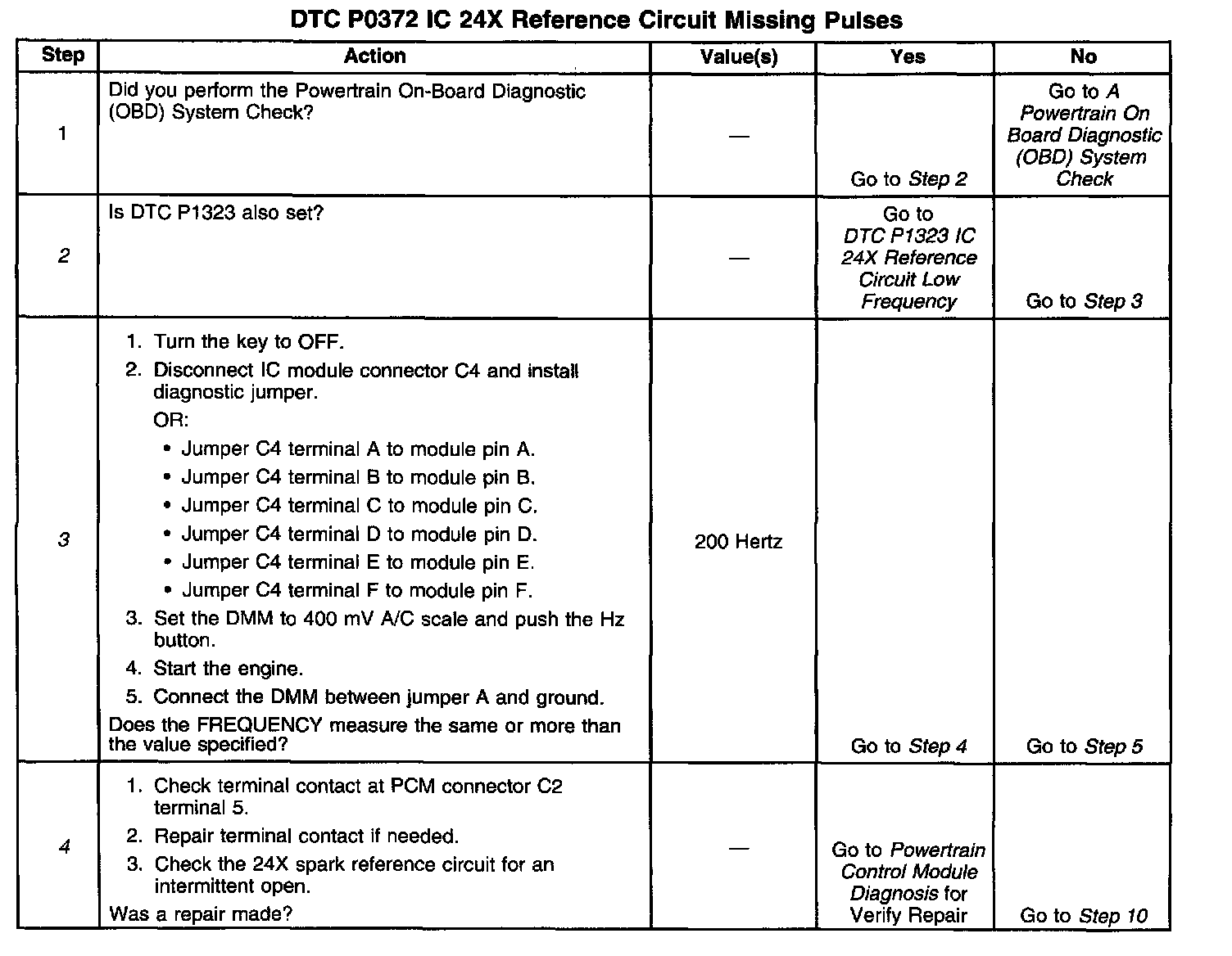 This diagnostic test checks for less than forty-eight pulses between CAM pulses. However, the number of 24X pulses is allowed to vary between 47 and 49, as long as any variances toggle between too few pulses, and too many pulses. If two variances don't toggle, i.e. they both had 47 reference pulses and eight 4X reference pulses were received between CAM events, then DTC P0372 is set because some 24X pulses were missed.
