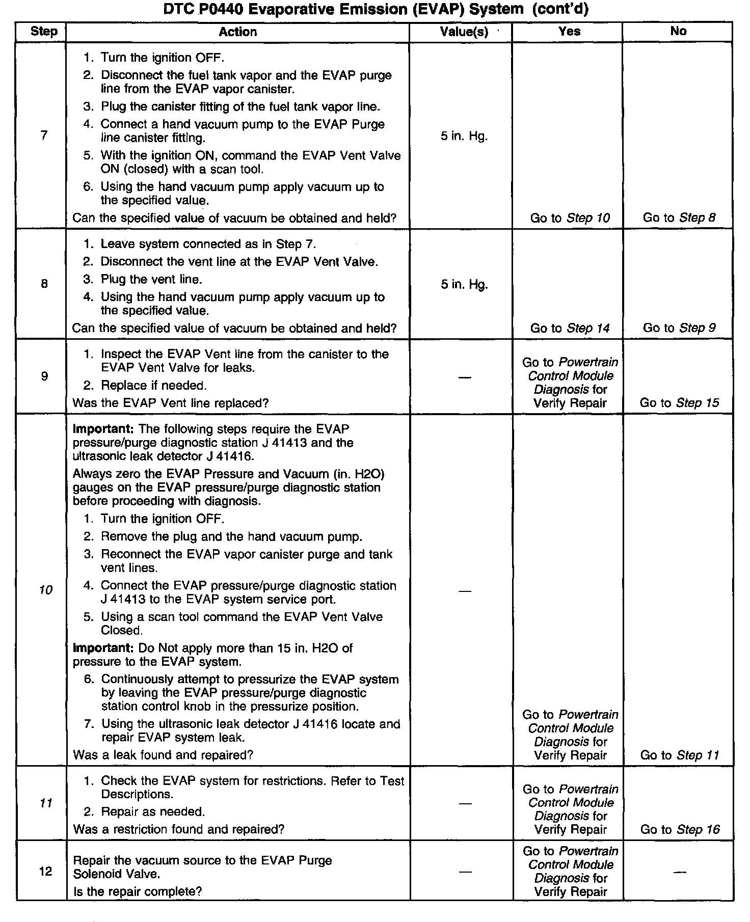 With pressure applied it may be necessary to disconnect the EVAP lines at the components to verify that a line or component is not restricted. A restriction would prevent a vacuum (or the Step 10 test pressure) from forming in the fuel tank.