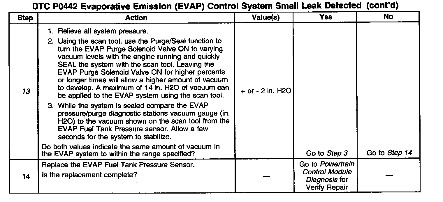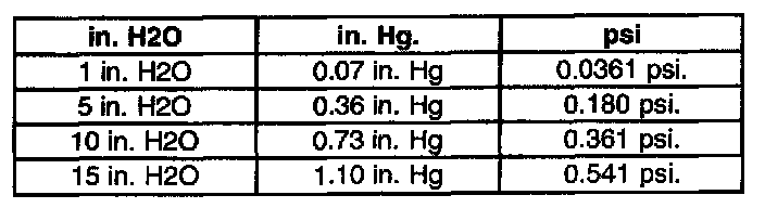 The vacuum and pressure in the EVAP system is measured in inches of H2O (water). Most gauges measure vacuum in inches of Hg (mercury) and pressure in psi (pounds per square inch). The chart shows how the values compare.