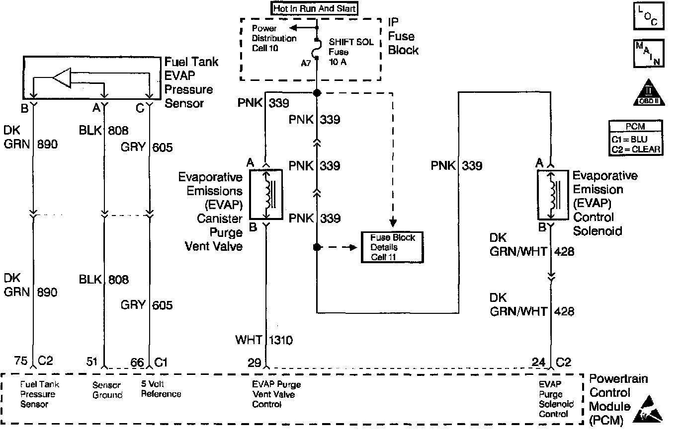The PCM monitors the amount of vacuum in the EVAP system by monitoring the Fuel Tank Pressure sensor. For this DTC the PCM turns ON both the EVAP Purge Valve and the EVAP Vent Valve when the Conditions for Running the DTC are met. This applies an engine vacuum to a closed EVAP system. The PCM turns OFF the EVAP Purge Valve when the system reaches the correct amount of vacuum. With the EVAP Purge Valve OFF and with the EVAP Vent Valve ON, the EVAP system should HOLD the vacuum in the EVAP system. This test will indicate a small leak if the EVAP system fails to hold enough vacuum for a specific length of time. This DTC will set after two consecutive failures of the above test.