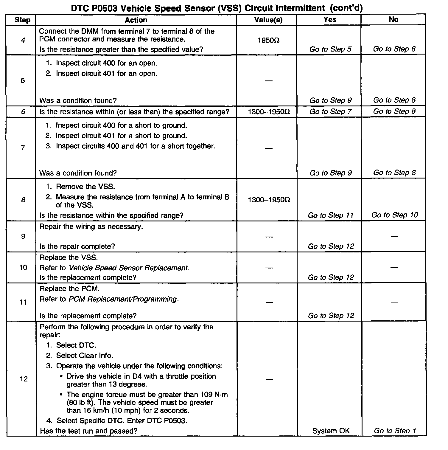 6. This step tests for a resistance value less than or equal to the specified VSS value. Resistance less than 1300 implies that the circuits are shorted together. Resistance within specification implies that circuit 400 or circuit 401 has a possible short to ground.