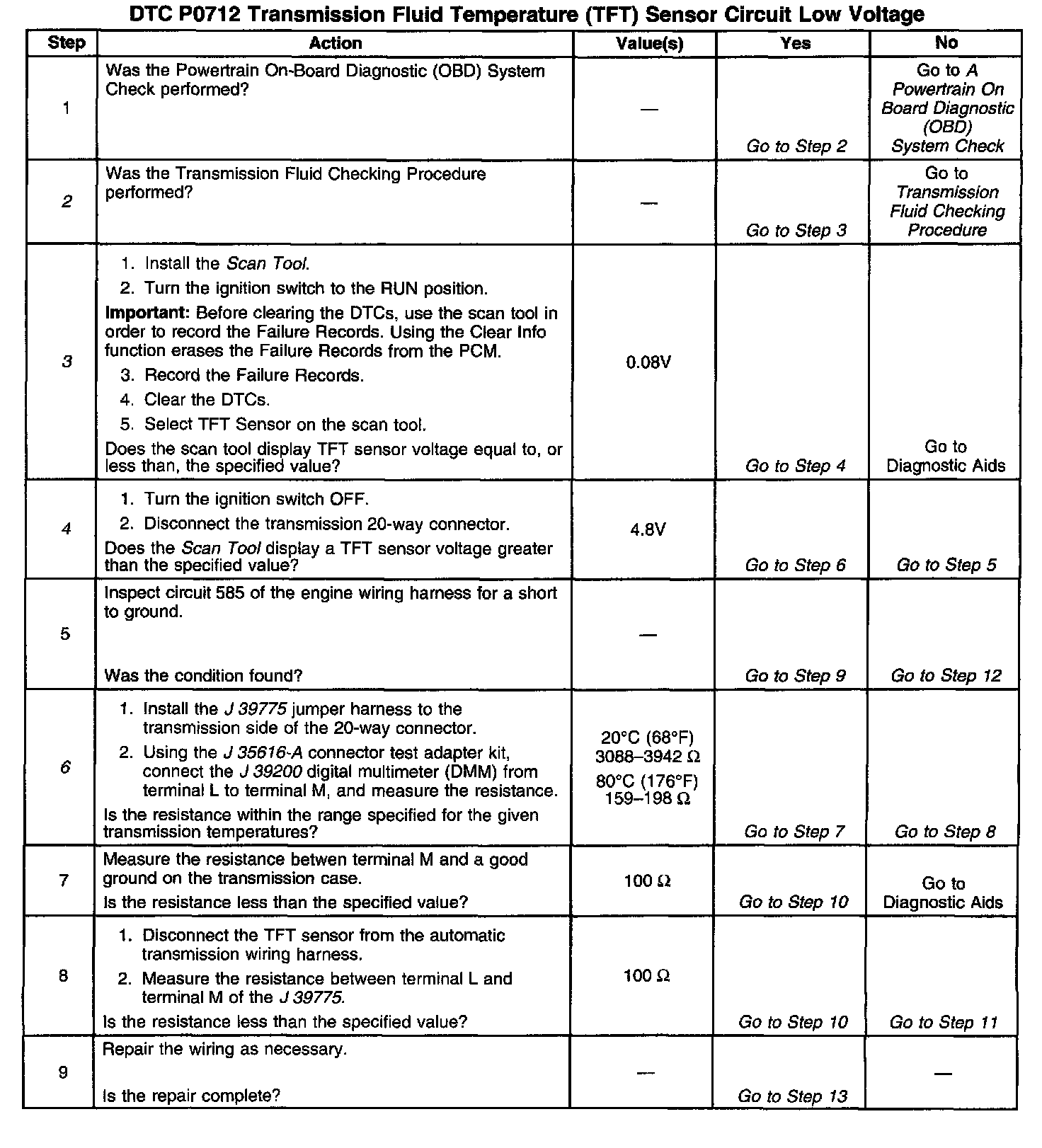 If the PCM detects a continuous short to ground in the TFT sensor circuit, then DTC P0712 sets. DTC P0712 is a Type D DTC.