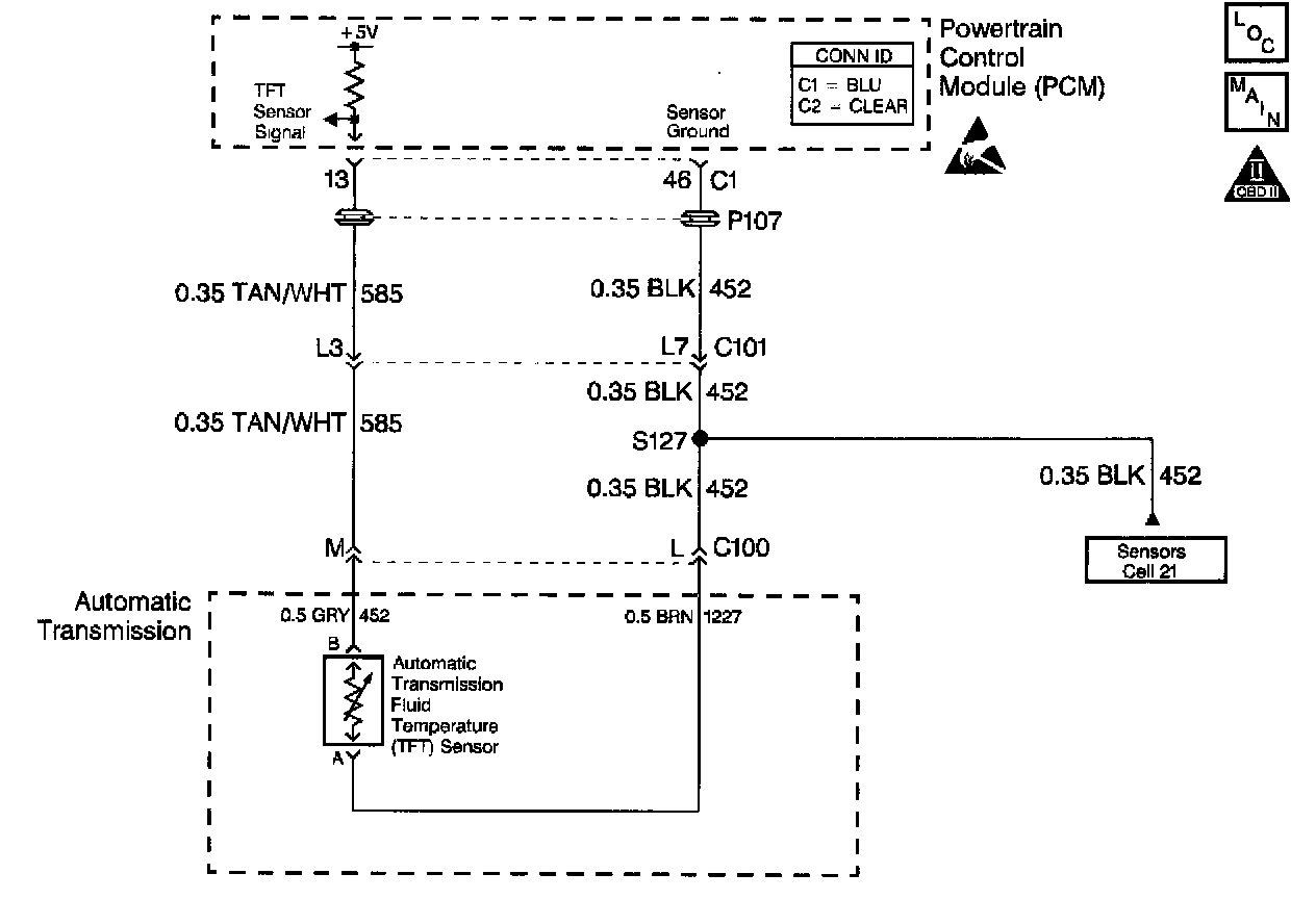 The automatic transmission fluid temperature (TFT) sensor is a negative coefficient thermistor whose resistance value changes based on temperature. The PCM provides a 5 volt reference to the sensor on circuit 585/452. A high fluid temperature or a short to ground on circuit 585/452 results in low signal voltage. The TFT operating range is -40 to +151°C (-40 to +305°F).
