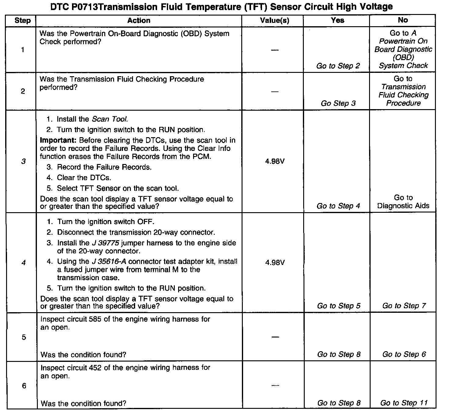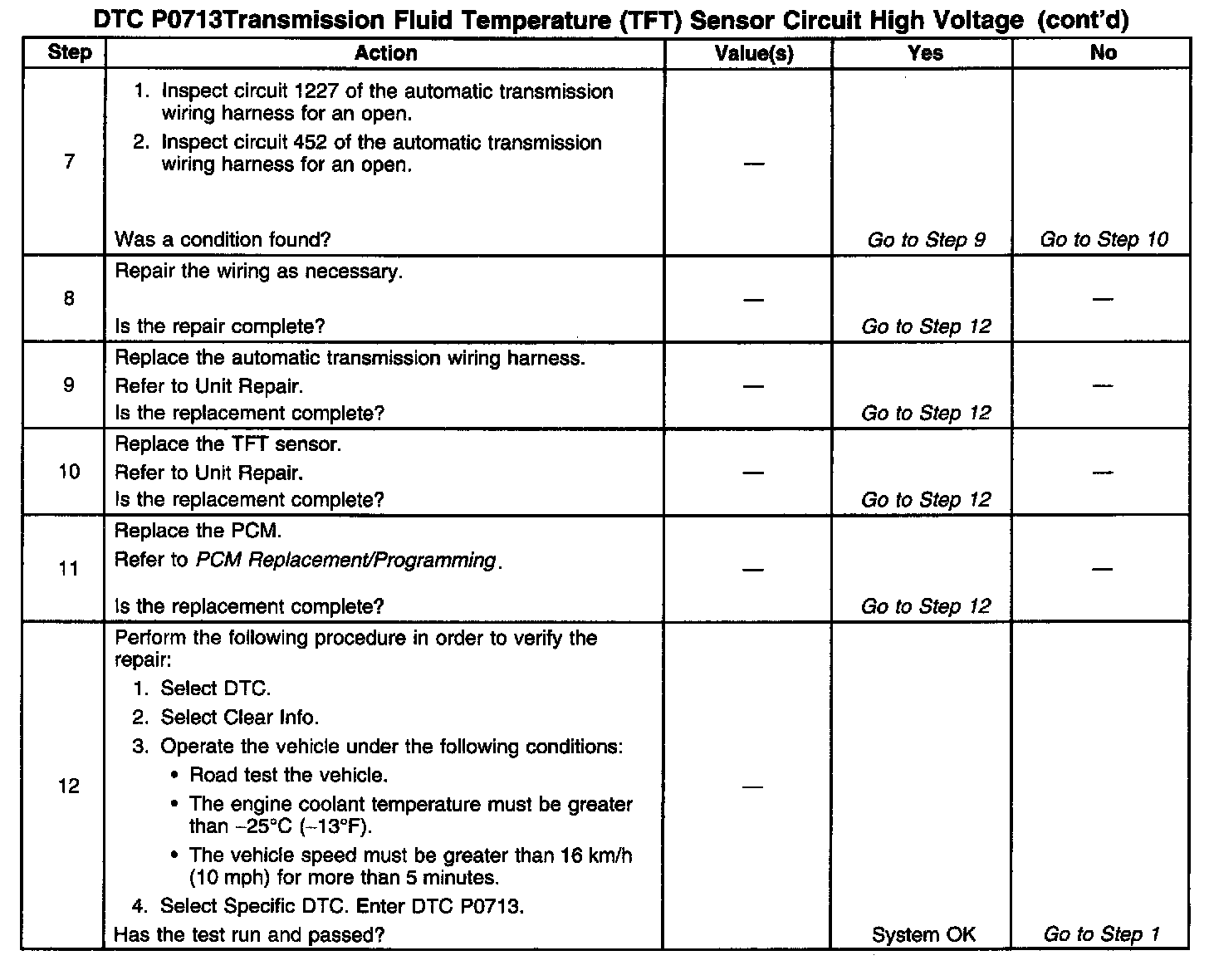 If the PCM detects a continuous open or a short to power on the TFT sensor circuit, then DTC P0713 sets. DTC P0713 is a Type D DTC.