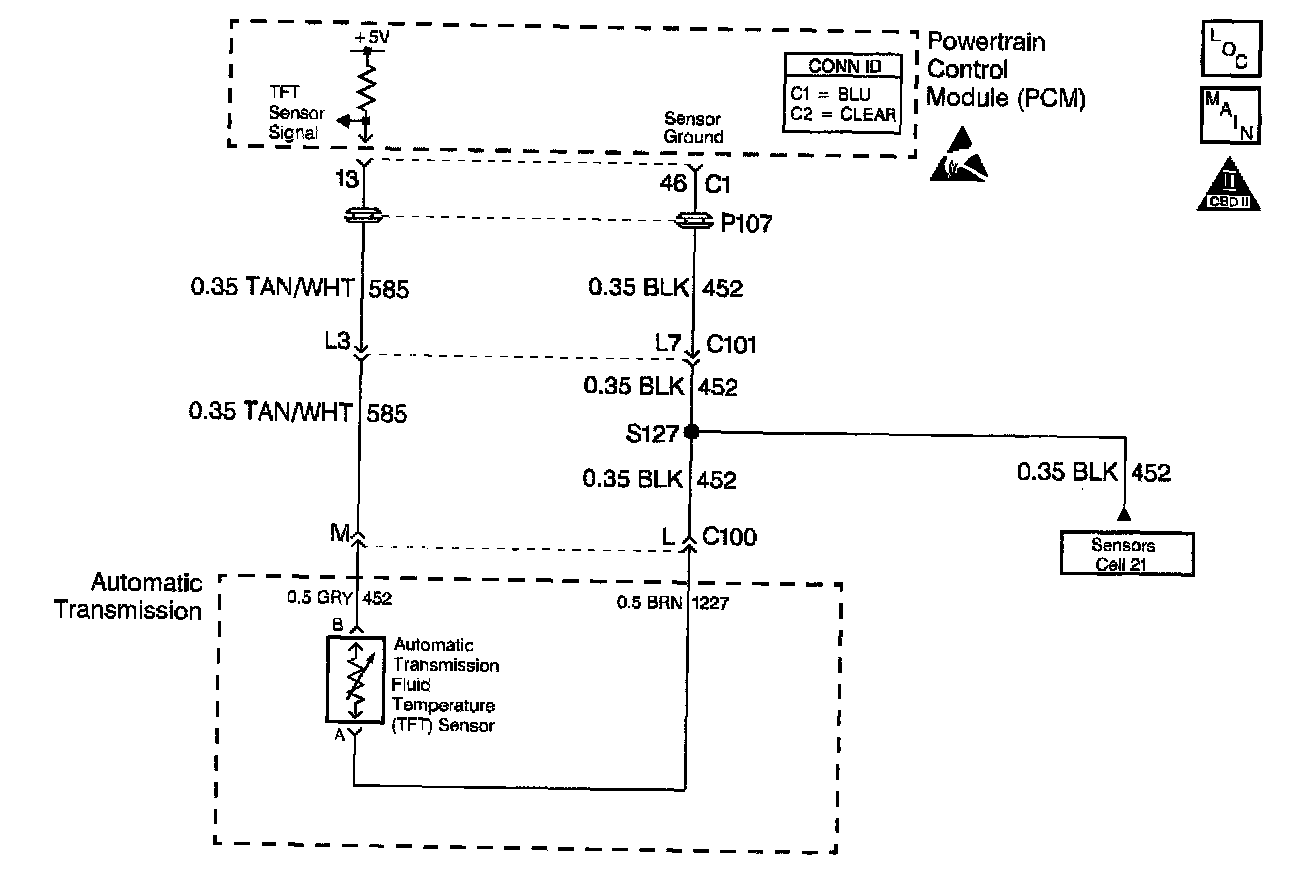 The automatic transmission fluid temperature (TFT) sensor is a negative coefficient thermistor whose resistance value changes based on temperature. The PCM provides a 5 volt reference to the sensor on circuit 585/452. A low fluid temperature or open circuits 585/452 or 1227/452 result in high signal voltage. The TFT operating range is -0 to +151°C (-40 to +305°F).