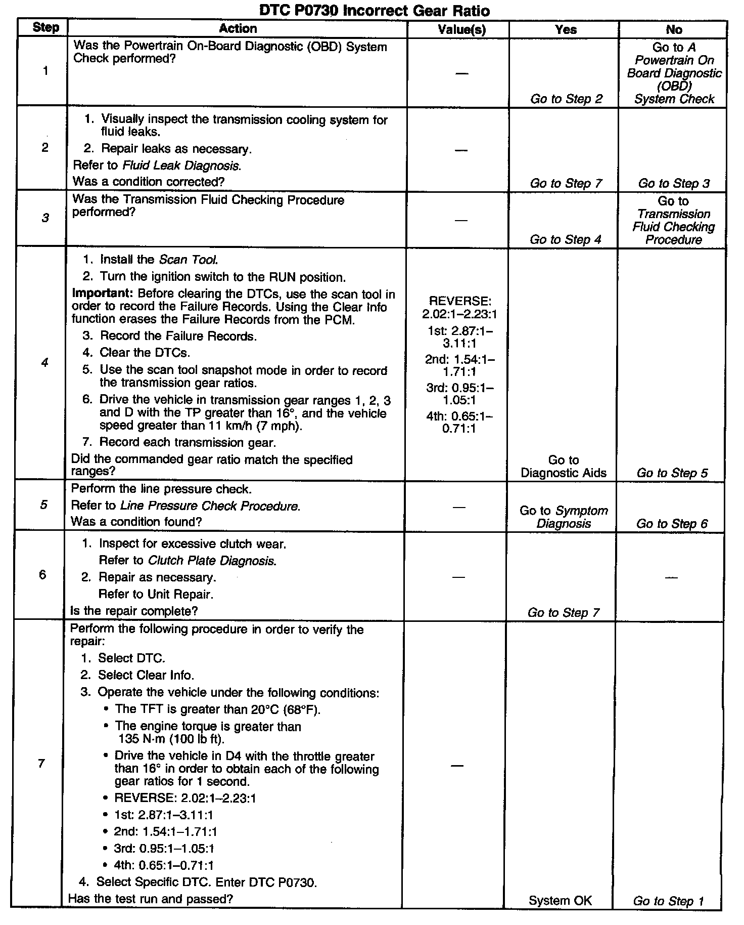 DTC P0730 sets if the steady state adapts are at their maximum, and the PCM detects an incorrect gear ratio because of excessive slip within the transmission. DTC P0730 is a Type C DTC.