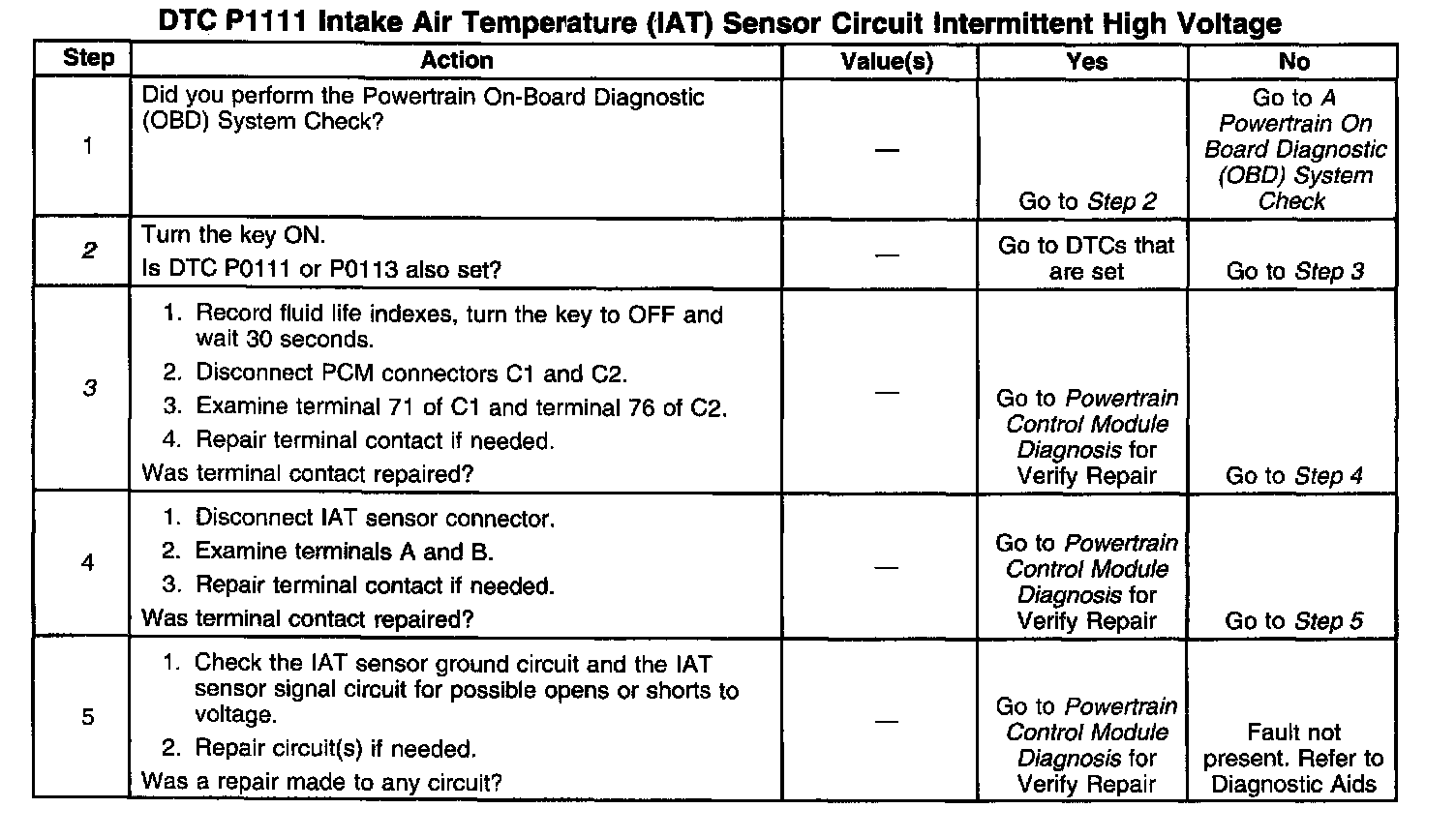 2. If DTC P0111 is also set, diagnose it first because it may help to pinpoint a faulty IAT sensor.