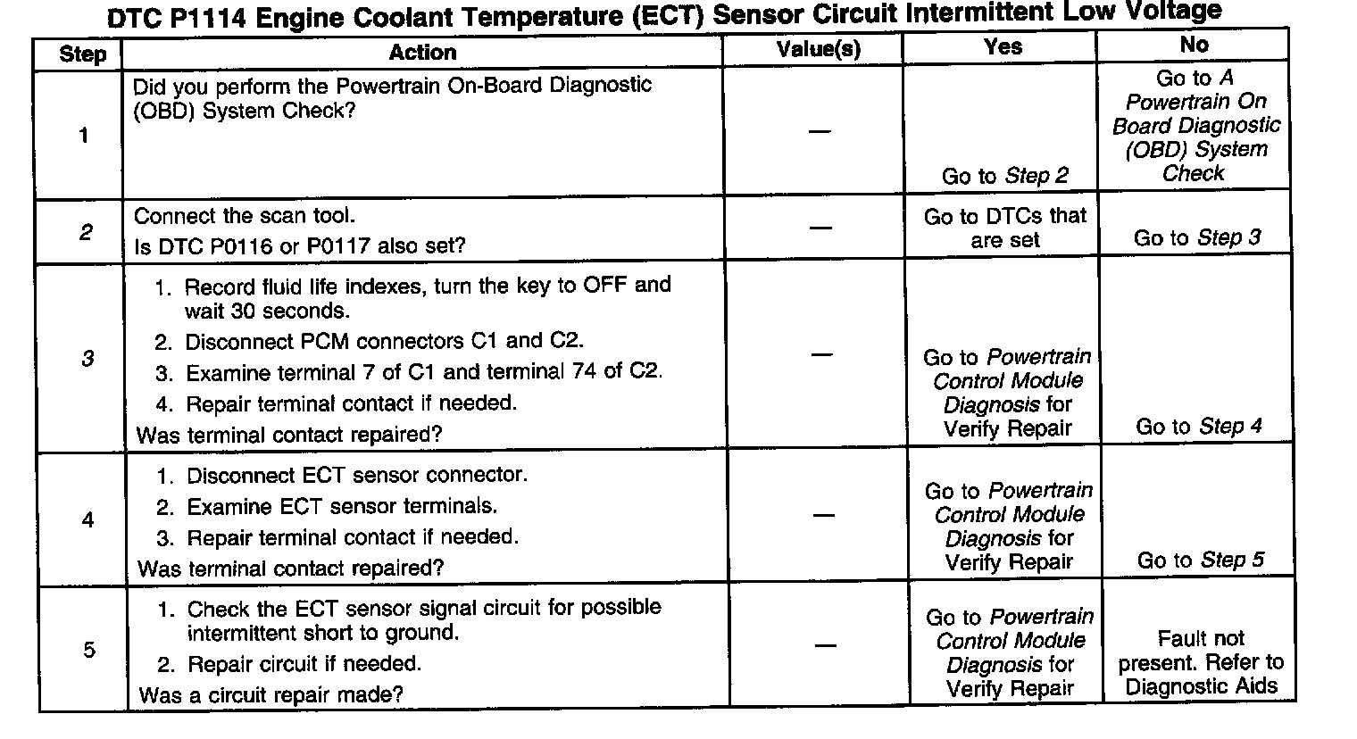 If fault is not present perform Powertrain Ground Check and also review Failure Rec. to determine conditions under which and how long ago the DTC set. If a faulty sensor is suspected refer to Temperature vs Resistance table. Component Tests and General Diagnostics