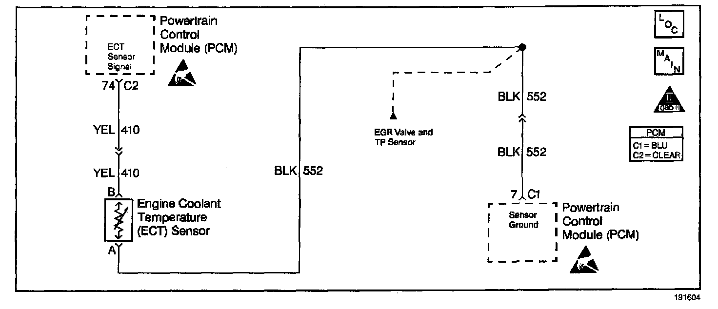 The Engine Coolant Temperature (ECT) sensor is a thermistor, a sensor whose resistance varies with temperature. The ECT sensor signal is on CKT 410 and sensor ground on CKT 808. As the temperature increases, sensor resistance decreases. High coolant temperature will result in low signal voltage on CKT 410. If the ECT reading is 151°C (304°F) or higher, The PCM sets DTC P1114.