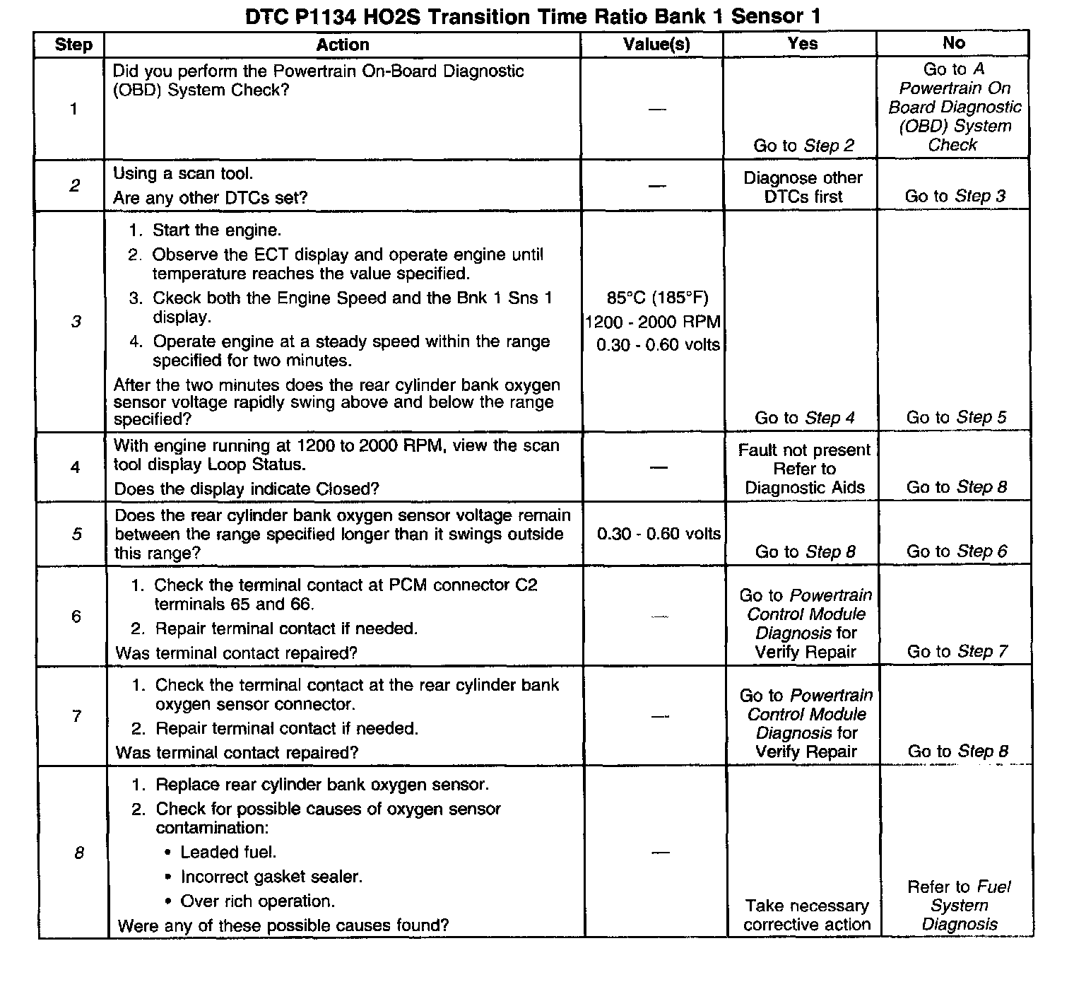 3. With the engine running warm, coolant at least 85°C (185°F) and at fast idle, the oxygen sensor voltage should rapidly swing above 0.60 volt and below 0.30 volt.