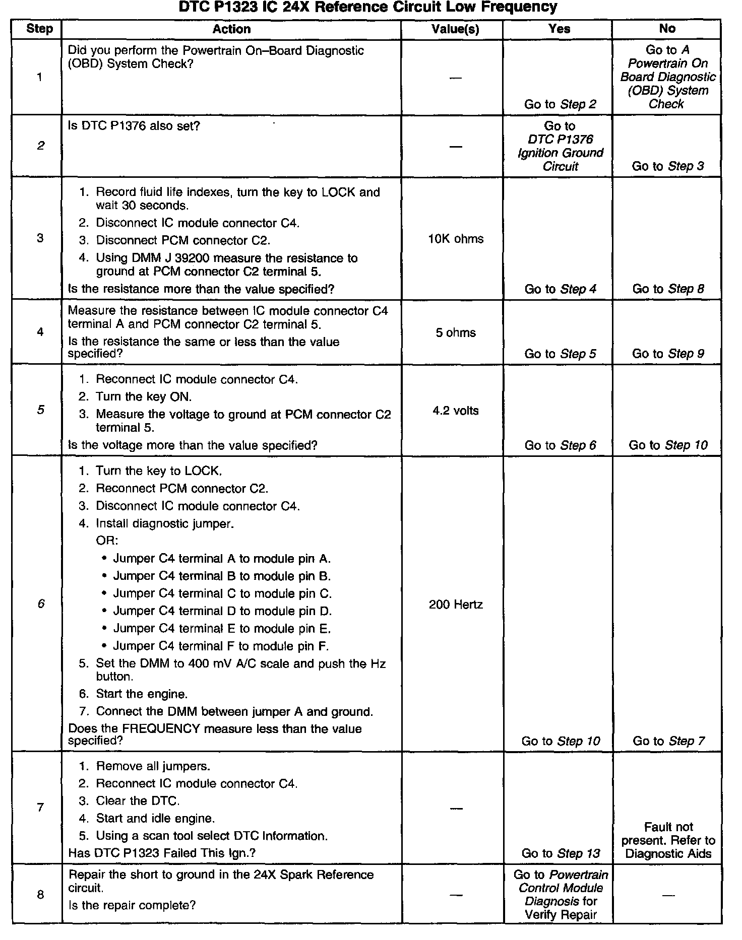 The Ignition Control Module creates a 4X signal and a 24X signal that is used by the PCM for ignition and fuel control. In this diagnostic test, the PCM checks for 4X reference pulses being received without 24X reference pulses. When the engine is running and the PCM is receiving 4X reference pulses without 24X reference pulses and the 24X reference signal line is low for 4 seconds, DTC P1323 is set.