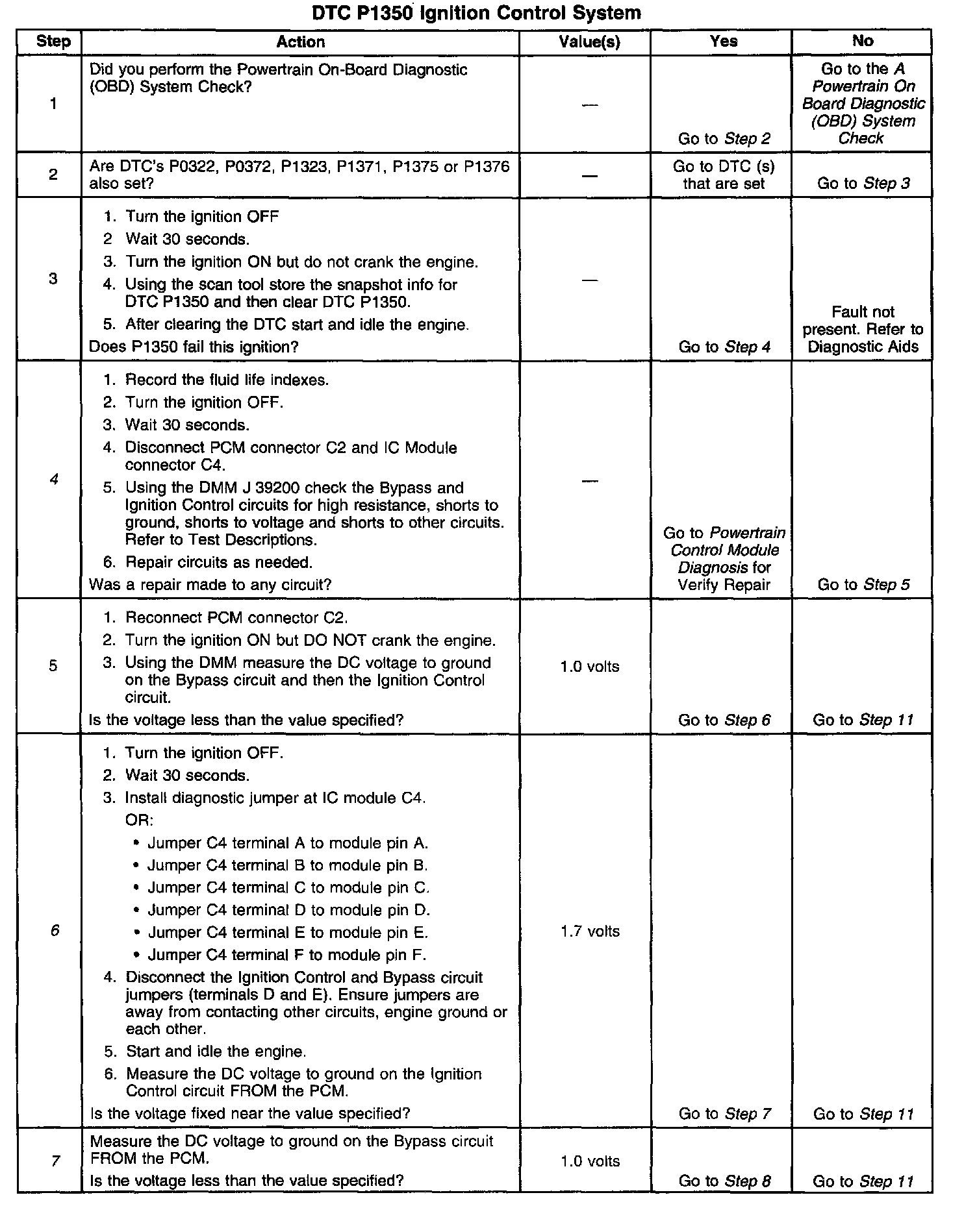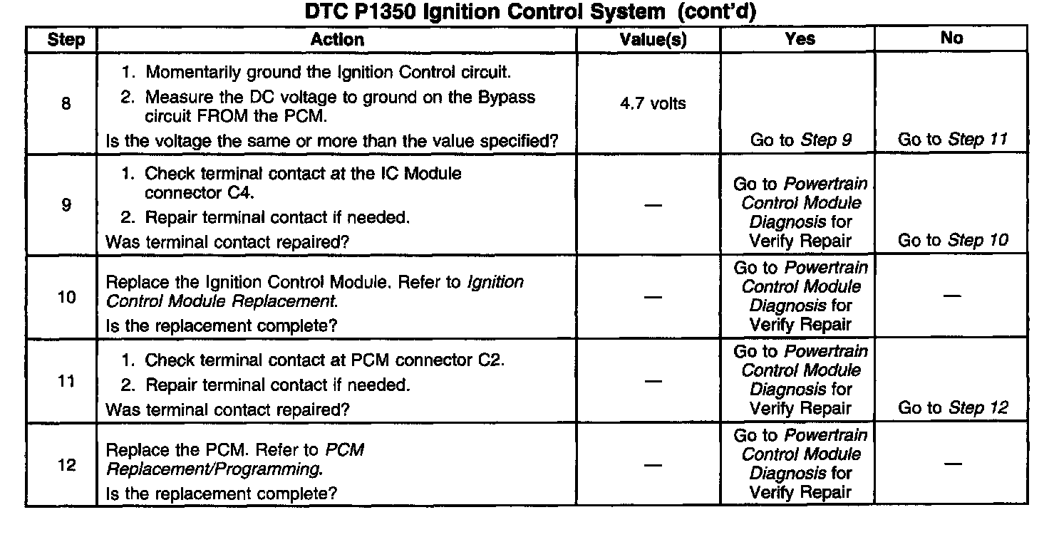Under normal system operation when the key is turned ON and until engine rpm is high enough for the PCM to control spark, the PCM will open the bypass circuit (CKT 424) to the Ignition Control Module, the IC module will then ground the Ignition Control circuit (CKT 423). This is called module mode because the IC module is controlling spark. Once the engine speed is high enough, about 65 rpm, 4X reference pulses are received and no PCM faults are detected the PCM will close the bypass line and in response the IC module will unground the IC circuit, this allows PCM control of spark. This is called the ignition control mode. This diagnostic test is used to check for faults in both the bypass circuit and the IC circuit. To inspect both circuits this diagnostic runs two tests, one during crank and one while running. If Ignition Control pulses are detected by the PCM on the IC line while in module mode, cranking, or if no Ignition Control pulses are detected by the PCM while in ignition control mode, running, DTC P1350 will set.