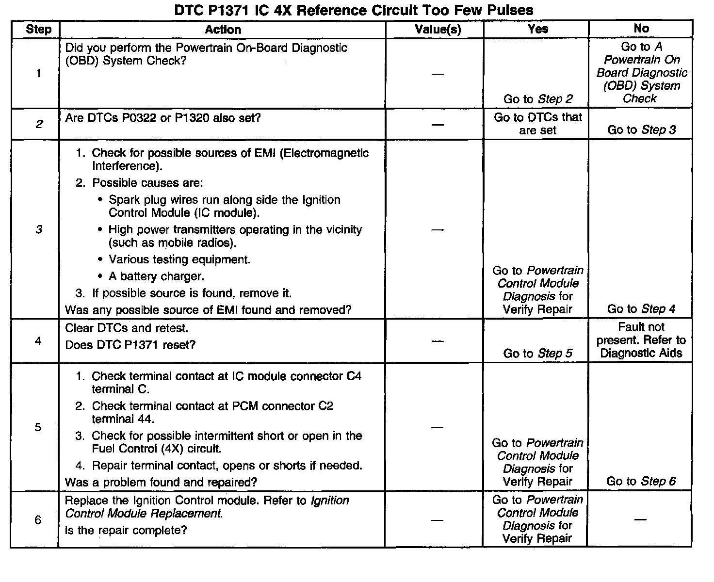 This diagnostic test checks for too few 4X reference pulses between CAM pulses. The PCM checks to see if there are 48 24X reference pulses between CAM pulses, and if there are, the PCM assumes it is receiving valid cam pulses. Therefore, if the PCM sees less than eight 4X reference pulses between cam pulses, it sets DTC P1371, because the 4X reference signal must be faulty.