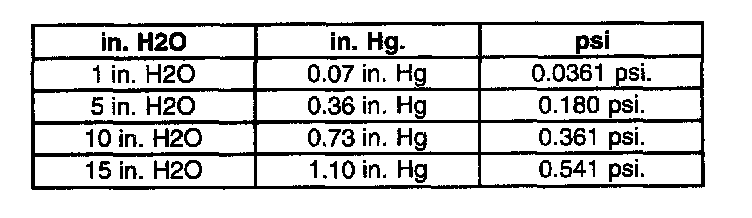 The vacuum and pressure in the EVAP system is measured in inches of H2O (water). Most gauges measure vacuum in inches of Hg (mercury) and pressure in psi (pounds per square inch). The chart shows how the values compare. Initial Inspection and Diagnostic Overview