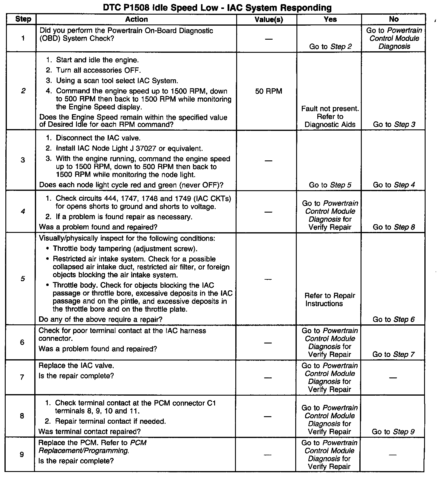 This diagnostic test is used to determine if the Idle Air Control (IAC) system is maintaining the proper idle speed. The IAC system controls idle speed by allowing a certain amount of air to bypass the throttle body, the throttle plate is closed during idle, through the IAC valve. The PCM controlled IAC motor moves a pintle in and out of the IAC valve, thus varying the amount air entering the intake manifold. By varying the amount of air intake, different idle speeds can be achieved. When the pintle is in, the valve is closed and low idle speeds result. When the pintle is out, the valve is open and high idle speeds occur. If the engine idle speed is less than the desired idle speed and all test conditions are met, the PCM will cycle the IAC valve and expect to see a change in the MAF sensor reading. If no change occurs DTC P1508 is set.