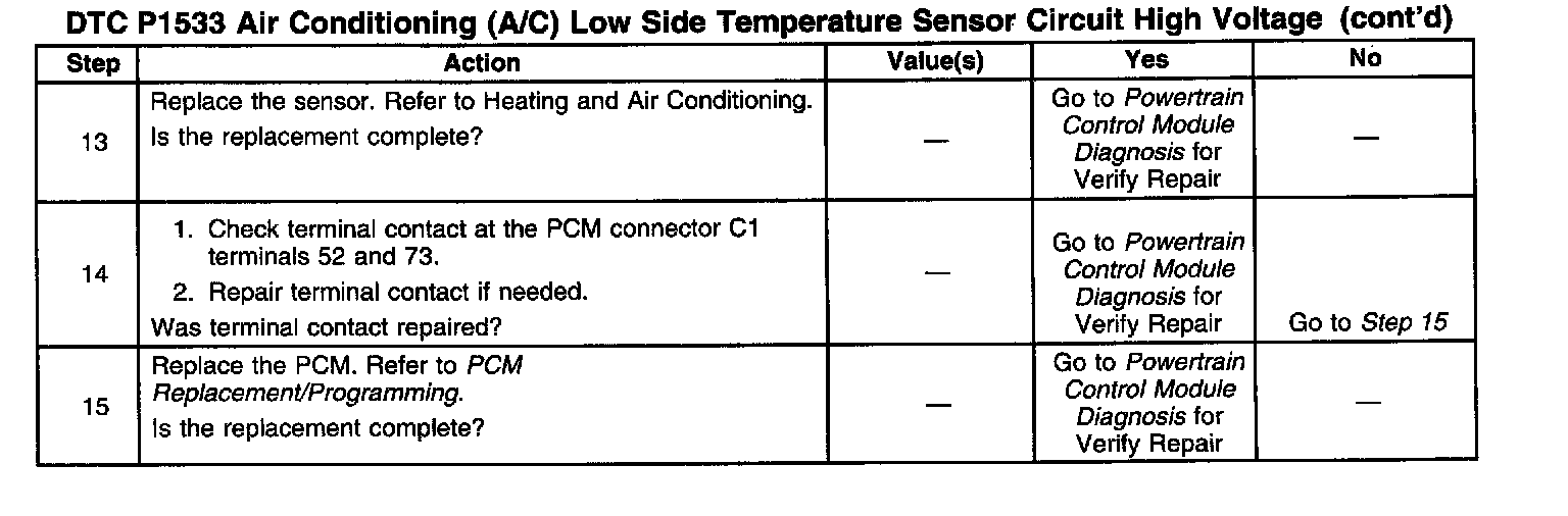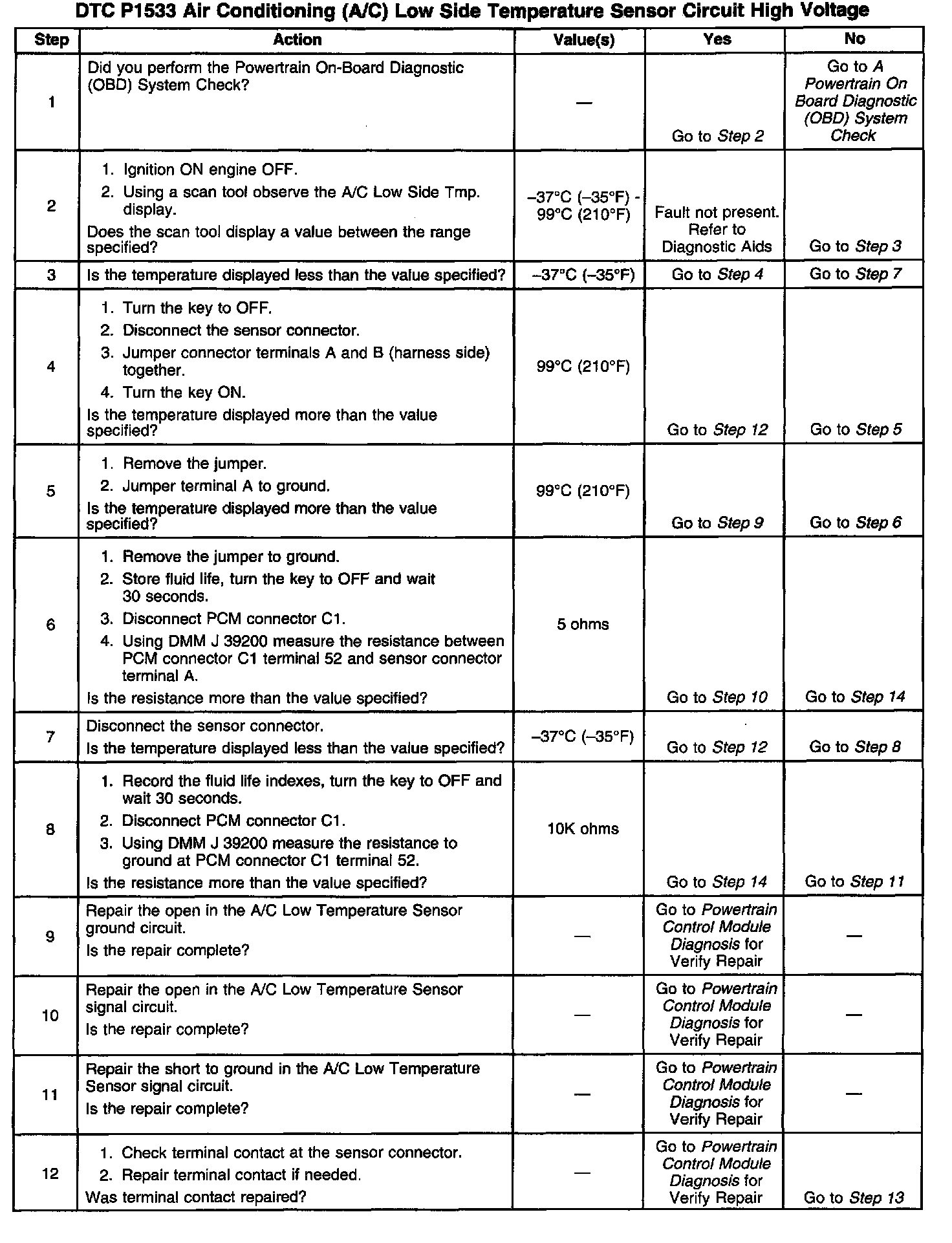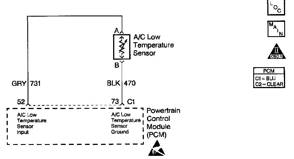 The Air Conditioning (A/C) low side temperature sensor uses a thermistor to control the signal voltage to the PCM. The PCM applies 5 volts on CKT 731 to the sensor. When the sensor is cold, its resistance is high; therefore, the PCM will see a high signal voltage. As the sensor warms, its resistance becomes less and the signal voltage is pulled low through the ground, CKT 470. This diagnostic detects a shorted to ground or open A/C low side temperature sensor circuit by setting the DTC if the PCM monitors a signal voltage, temperature, that is too high or low.