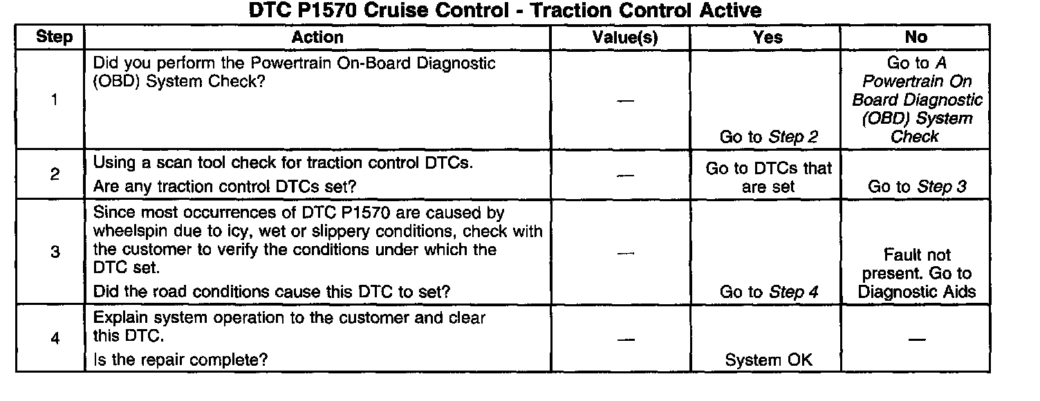 This diagnostic test indicates that cruise control and traction control are active at the same time. It is a protective measure to disable the cruise control for example, when traveling on icy roads and traction control requests a maximum torque of less than 1%. Under these conditions DTC P1570 is set and the cruise control will be disengaged. The driver should be advised why the cruise disengaged. Clear the DTC and road test vehicle to verify normal operation.