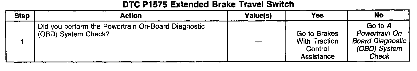 This diagnostic test functions on the assumption that a sudden decrease in non-drive, rear, wheel speed must be caused by a brake application. Non-drive wheel speed and stop lamp switch status are supplied to the PCM through serial data from the Electronic Brake and Traction Control Module (EBTCM). If there is a 6 mph or greater decrease of non-drive wheel speed in 0.4 seconds and a transition of the contacts at the Torque Converter Clutch (TCC) brake switch or stop lamp switch without a transition of the extended travel contacts of the TCC/antilock brake switch, DTC P1575 is set.