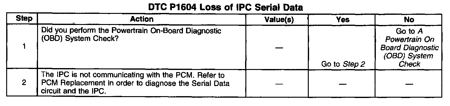 This diagnostic test checks for the loss of or invalid Instrument Panel Cluster (IPC) serial data to the PCM. When such a condition exists for 11 seconds, DTC P1604 is set.