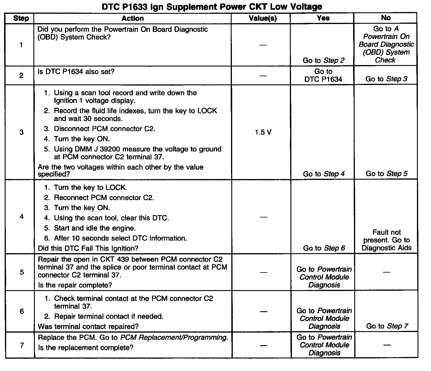 The PCM is powered with 5 power feeds. Two of these feeds are from the battery, the other three are from the ignition switch and are called Ignition 1, Ignition 0 and Ignition Supplement. The ignition feeds are powered any time the key is in the CRANK, RUN or ACC positions. This diagnostic test is used to monitor the Ignition Supplement voltage received at PCM connector C2 terminal 37. The PCM monitors this voltage and if it drops too low for 1 second, DTC P1633 will set.