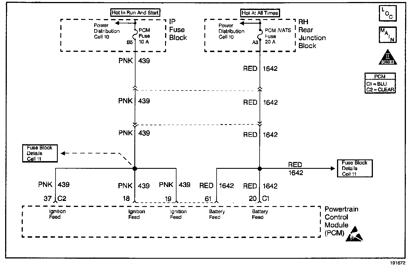 Voltage difference between Ignition 1, PCM C1-19, and Ignition 0, PCM C1-18, inputs greater than 2 volts for 5 seconds.