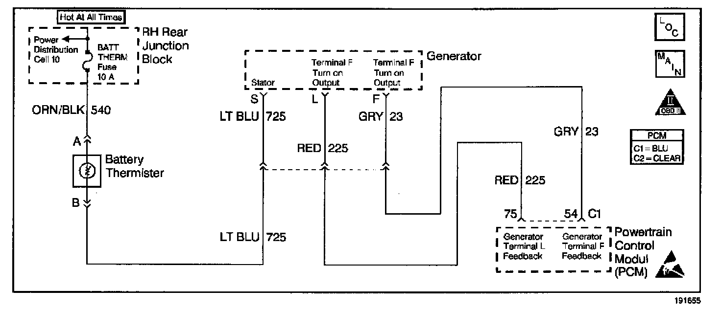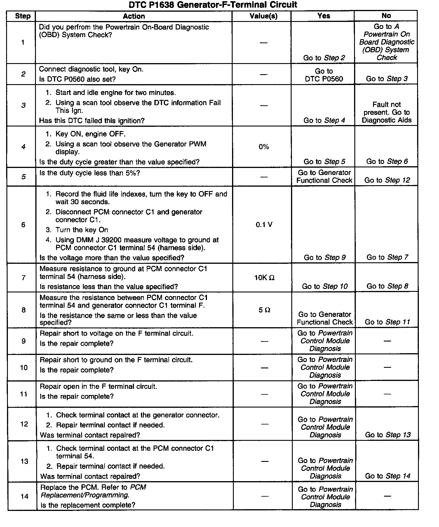This diagnostic DTC is used to monitor the field voltage of the generator. The generator is able to produce the desired voltage by varying the duty cycle of the field current. At low engine speeds, the field may have a duty cycle of 90%. At higher engine speeds and lower electrical loads, the duty cycle will be less. The generator produces a PWM signal that is monitored by the PCM on CKT 23 at connector C1 terminal 54. This signal duty cycle is sent to the PCM and if it falls below a certain duty cycle for too long, DTC P1638 will set.