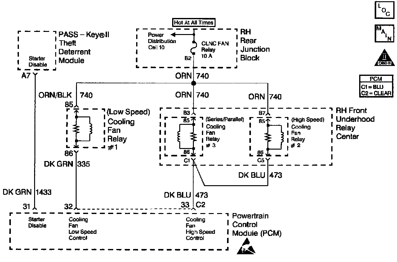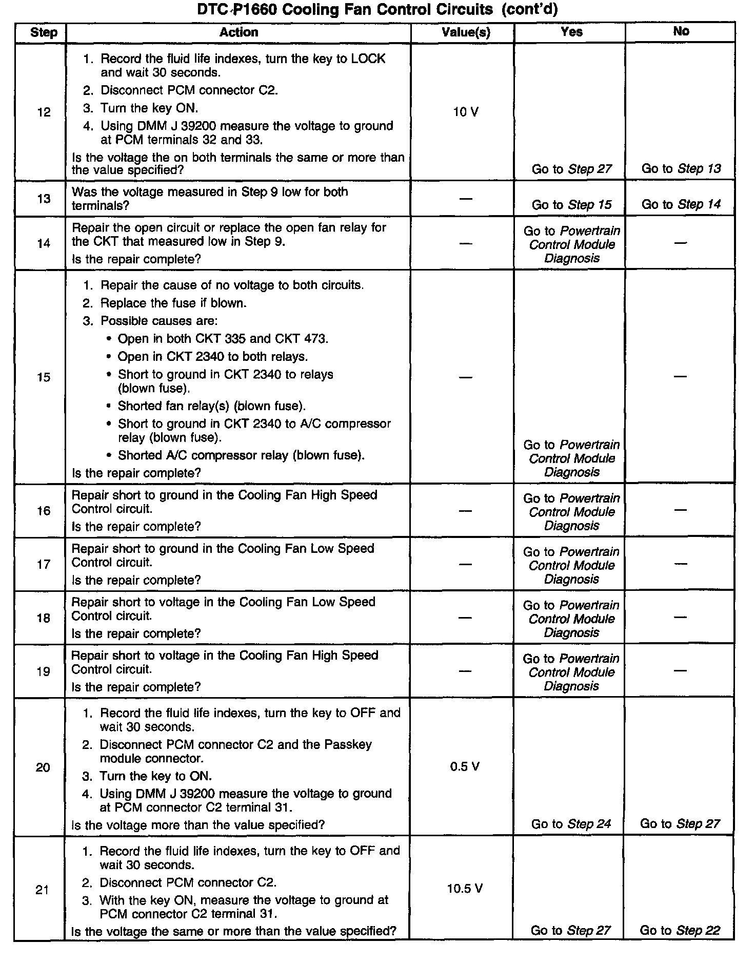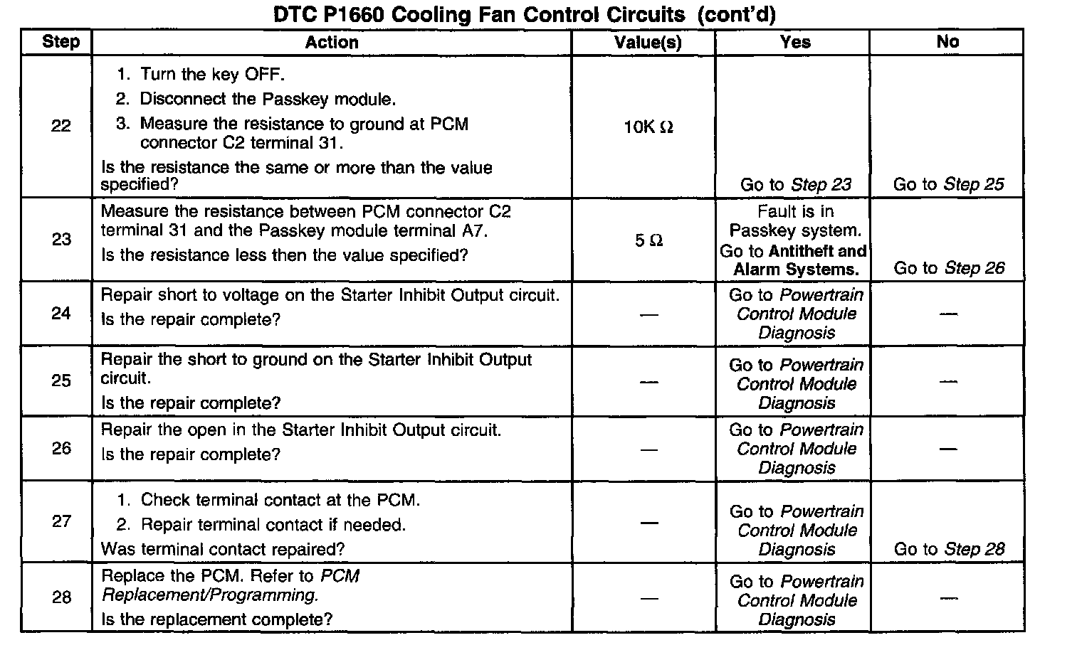 The PCM contains a chip called a Quad Driver Module that provides 4 switchable ground outputs for operating solenoids, relays, telltales, and other devices. Each of these ground outputs has an internal fault line that feeds back to the PCM's microprocessor. When the output is OFF, the quad driver should receive the 12 volts fed to the solenoid, relay, etc. When the output is ON, the Quad driver should receive 0 volt since it is grounding the output. If it receives 0 volt when the output is OFF or 12 volts when the output is ON, it sets the fault line low. DTC P1660 is used to monitor the fault line of the cooling fan control relay output and the starter inhibit output.
