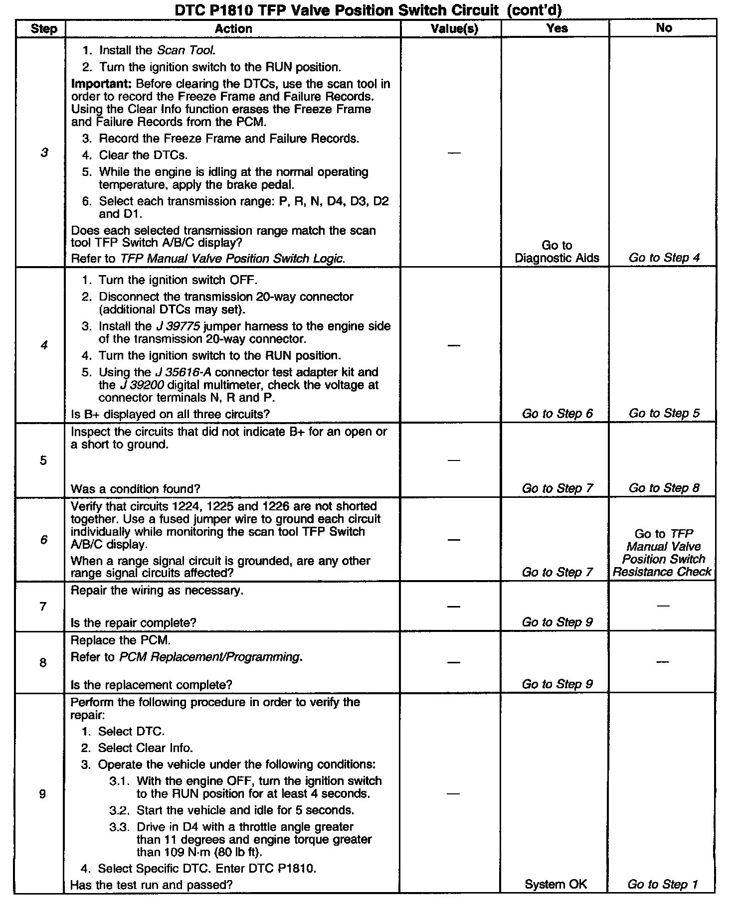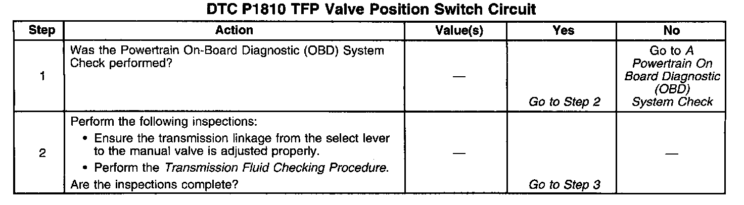 If the PCM detects an invalid combination of the TFP manual valve position switch, then DTC P1810 sets. DTC P1810 is a Type B DTC.