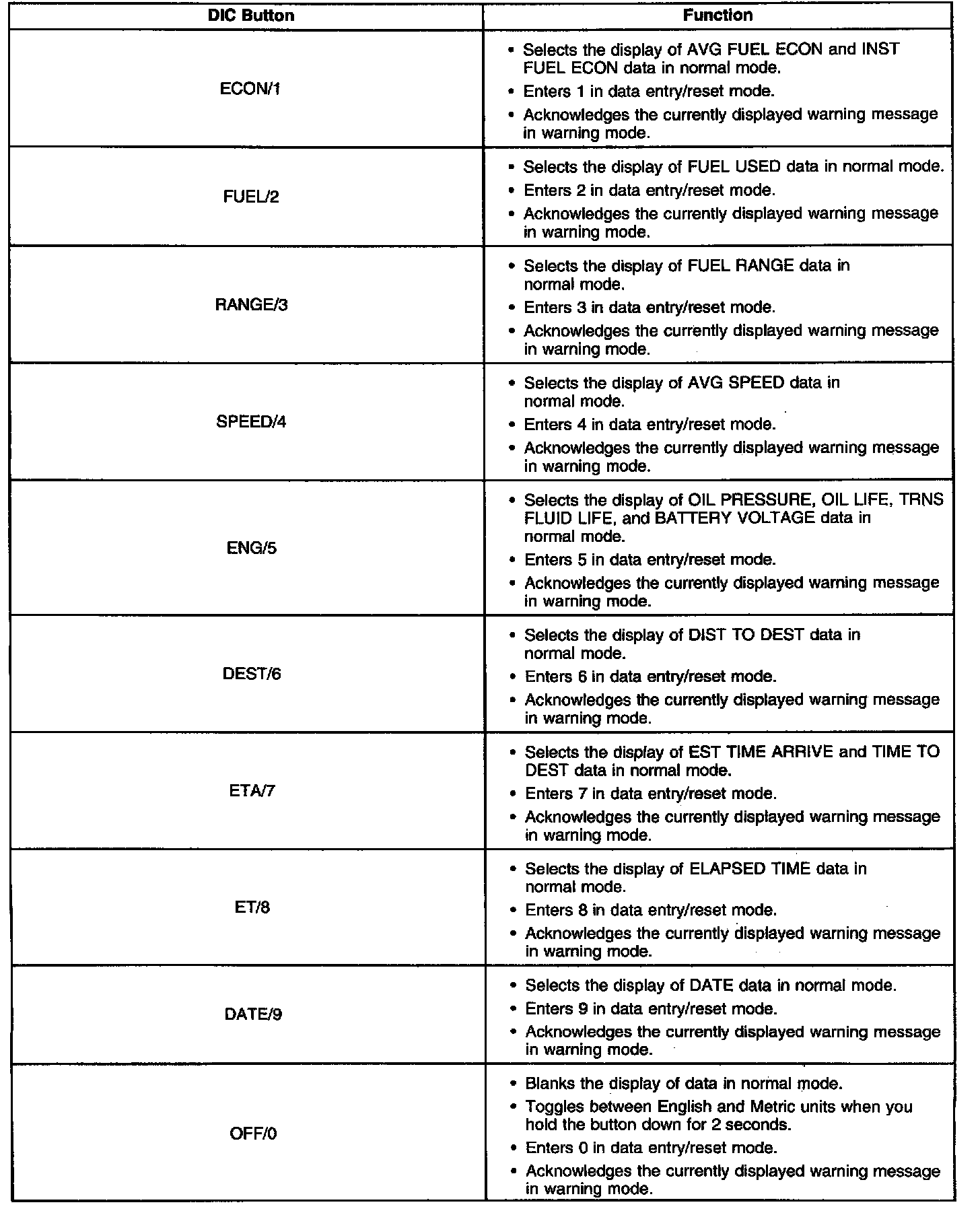 Within an ignition cycle, when you return to the ECON ENG, or ETA functions, the DIC displays the previous message displayed within that switch function.