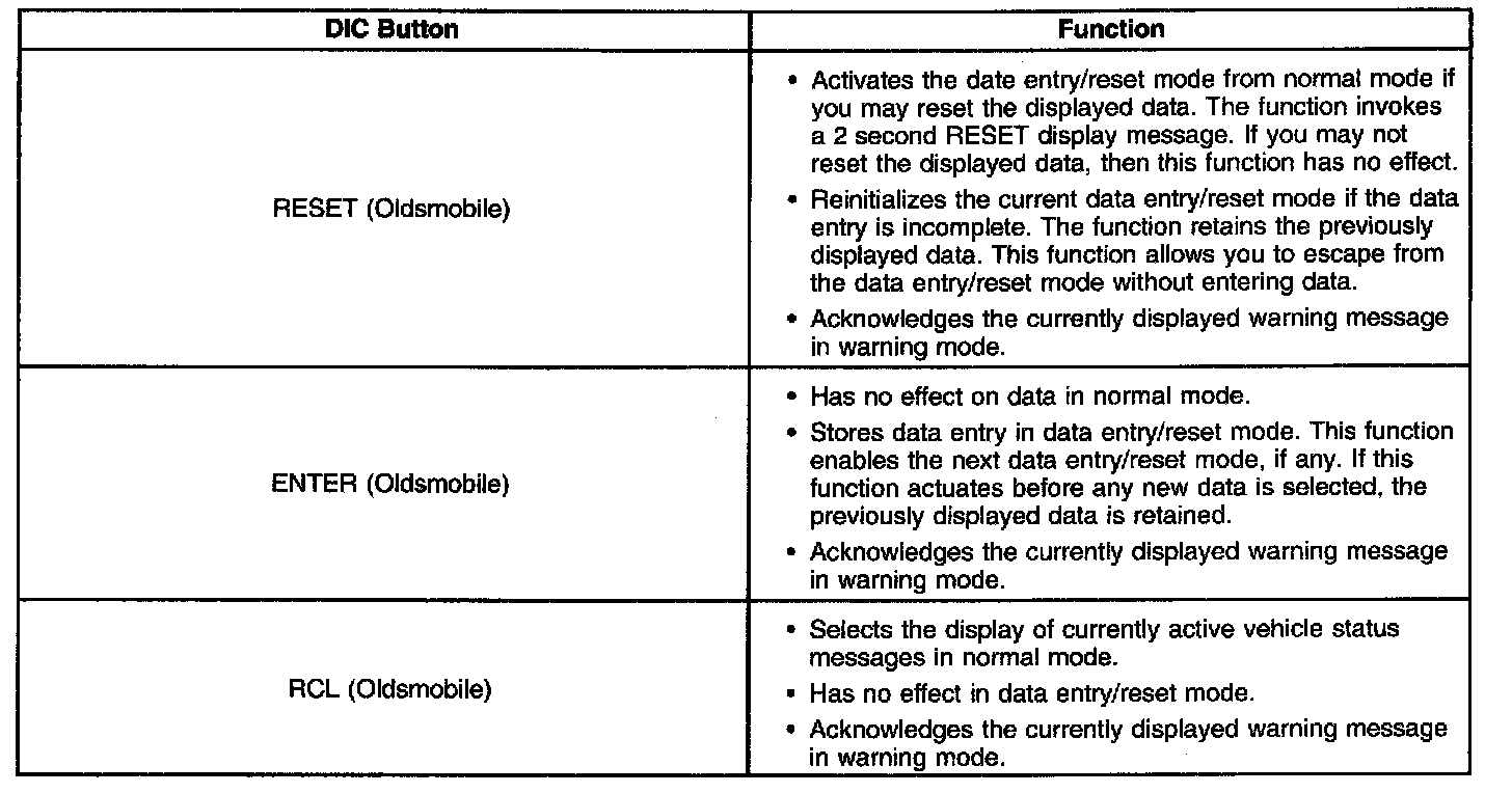 The driver information center (DIC) consists of a 20 character vacuum fluorescent display. The display conveys to the driver information concerning various vehicle systems. The DIC is part of the heater and air conditioning (A/CC) control. The DIC communicates with the instrument cluster via the universal asynchronous receiving/transmitting (UART) B serial data line. The DIC messages are accompanied by a chime within the instrument cluster. The DIC displays the following warnings and information: