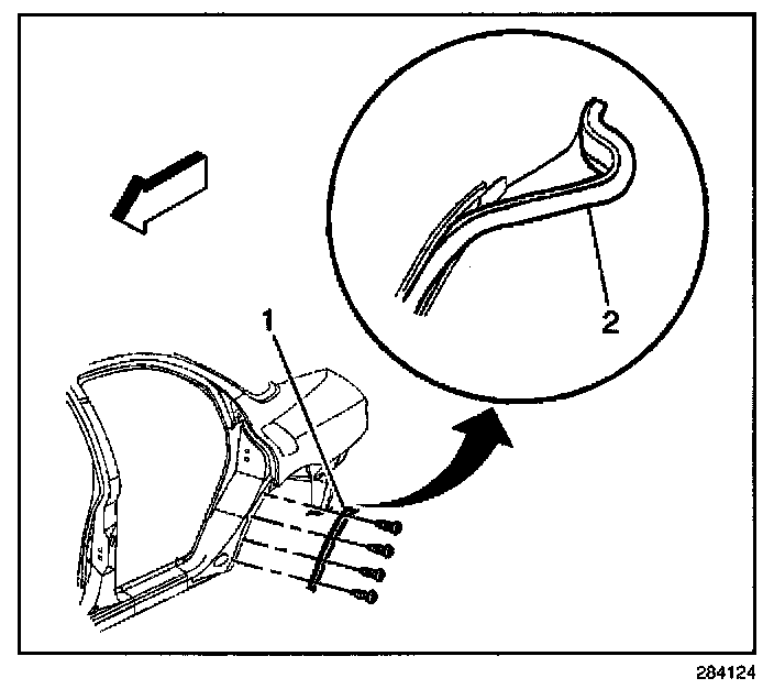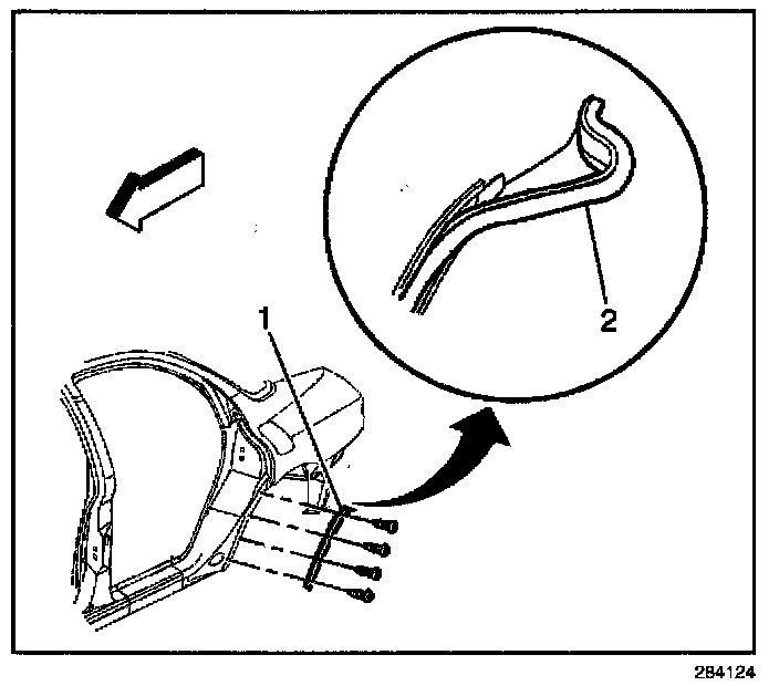 1. Align the auxiliary weatherstrip seal (2) into the molded pocket.