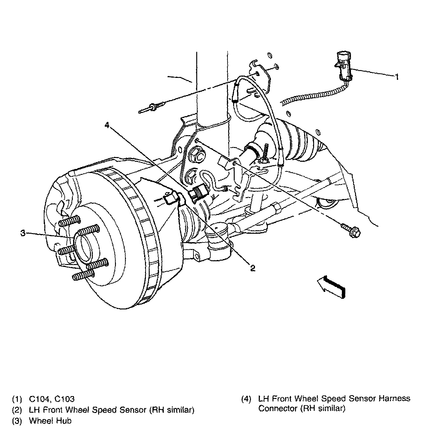 LH Front Wheel Speed Sensor: Behind the left front wheel, on the back of the hub