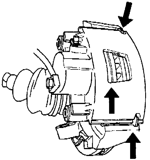 When inspecting the disc brakes, check both ends of the outer shoe and lining by looking in at each end of the caliper. These points are where the highest rate of wear normally occurs. Also, check the inner shoe lining to make sure that it has not worn prematurely. Look down through the hole in the top of the caliper to view the inner shoe. Some inboard shoe and linings have a thermal layer against the shoe, integrally molded with the lining. Do not confuse this extra layer with uneven inboard-outboard lining wear.