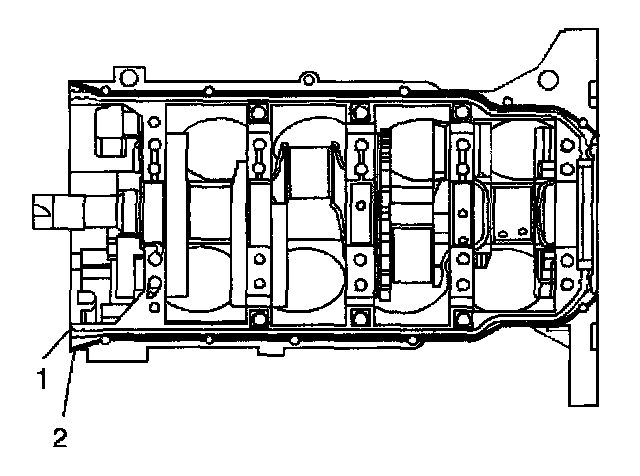 3. Apply a thin bead (2) of Gasket Maker, GM P/N 1052942 or equivalent, to the upper crankcase. The bead should run parallel to the silicone seal (1) and through the centerline of the bolt holes but not through the bolt holes. Starting from the front of the block, the bead should be about 1 mm thick until the first bolt hole. Expand to 2.5-3 mm thick from the first to the third bolt hole. After the third bolt hole the bead should be reduced to 1 mm until running off the end of the crankcase. Do not continue the bead all the way to the rear crankshaft seal.