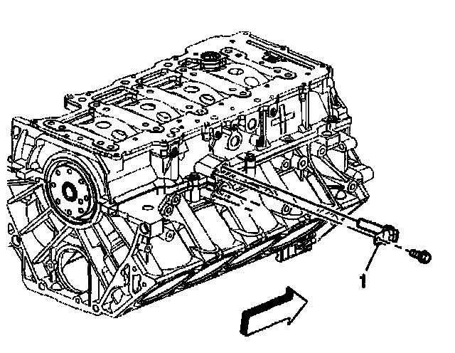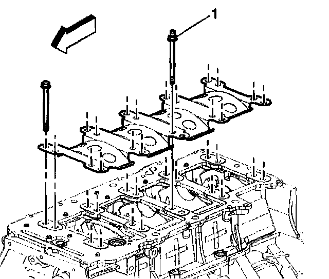 10. Install the main bearing bolts. The single stud-head bolt (1) used for oil pump pick-up mounting goes in the inboard position of the third set of main bearing bolts from the front of the engine.
