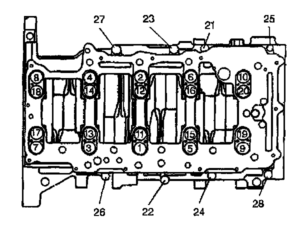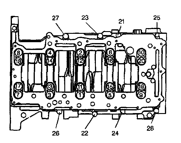 14. Tighten the upper-to-lower crankcase perimeter bolts (numbers 21 through 28).