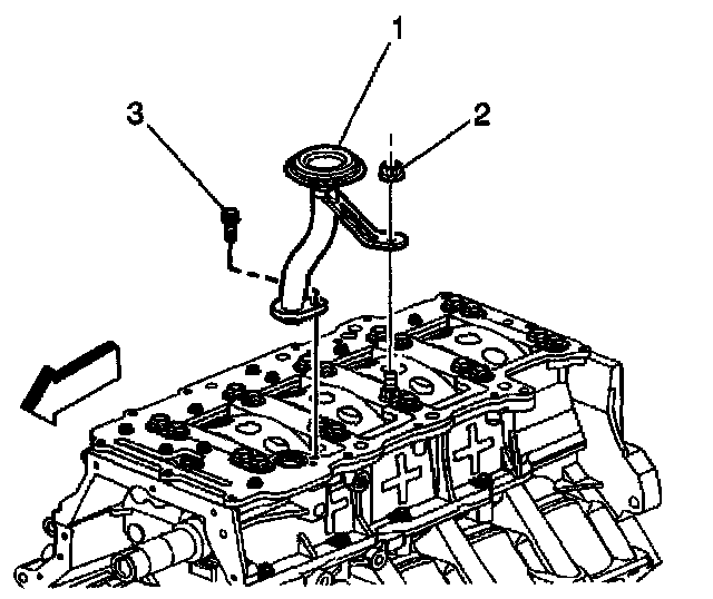 16. Install the oil pump pick-up retaining bolt (3) and nut (2).