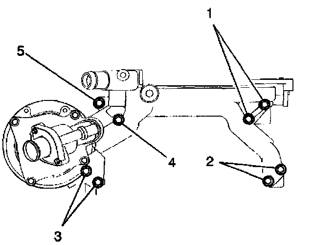 ^ Tighten all water crossover bolts (1-5) to 25 Nm (18 ft. lbs.).
