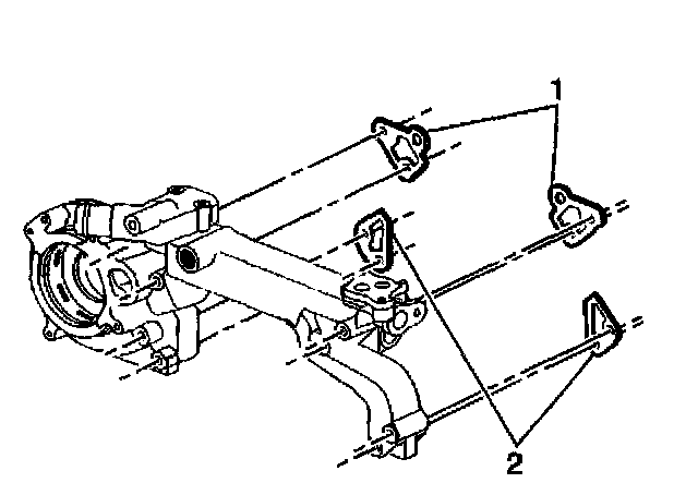 2. Slide the upper (1) and lower.(2) water crossover gaskets onto the bolts with the crossover still on the bench.