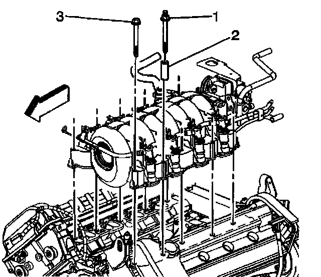 ^ Tighten the intake manifold bolts and studs starting from the center and working outward in a circular pattern to 10 Nm (89 inch lbs.).
