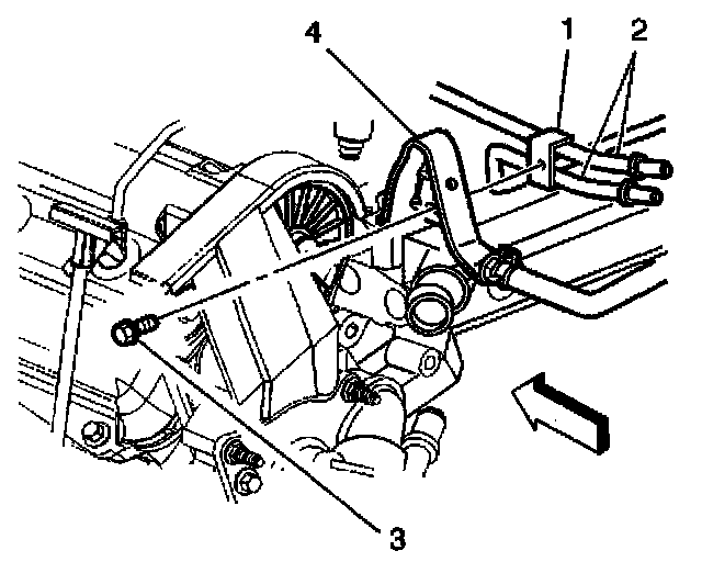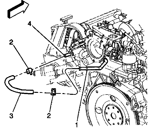 3. Connect the throttle body coolant hose (3) to the throttle body inlet pipe (1) and water crossover (4) with hose clamps (2).