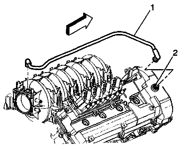 11. Connect the dirty air PCV tube (1) to the PCV valve (2) and camshaft cover.