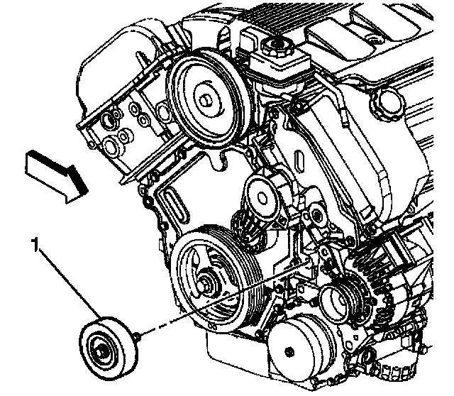 1. Place the drive belt idler pulley and bolt (1) in position.