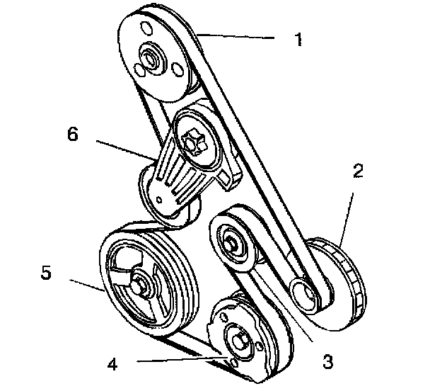 1. Route the accessory drive belt around the crankshaft (5), the air conditioning compressor (4), the idler (3), the generator (2), and the drive belt tensioner (6) pulleys.
