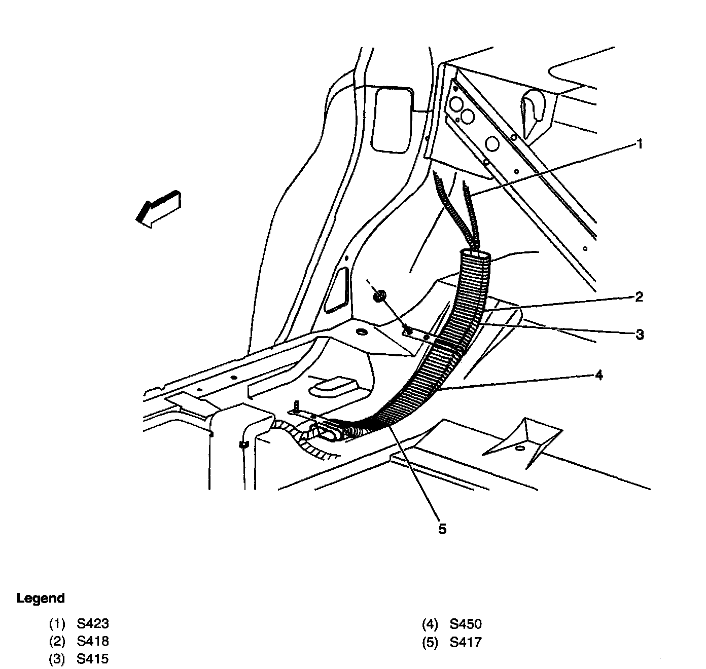 In the body harness, approx 112.5 cm (44.2 in) from the P800 pass-through