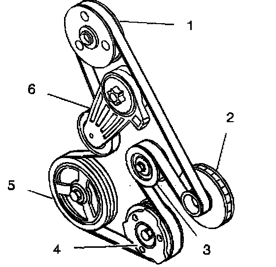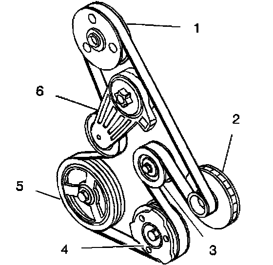 6. Remove the belt from the crankshaft (5) and air conditioning compressor (4) pulleys.